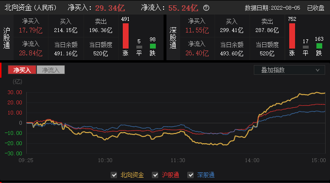 8月5日,北向资金净买入约29.34亿元。其中,沪股通净买入17.79亿元,深股通净买入11.55亿元。