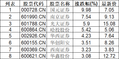 证券板块拉升,国元证券(000728.CN)涨9.98%