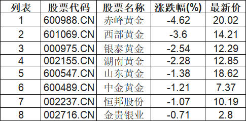 贵金属板块下挫,赤峰黄金(600988.CN)跌4.62%