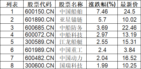 船舶制造板块拉升,中国船舶(600150.CN)涨7.46%