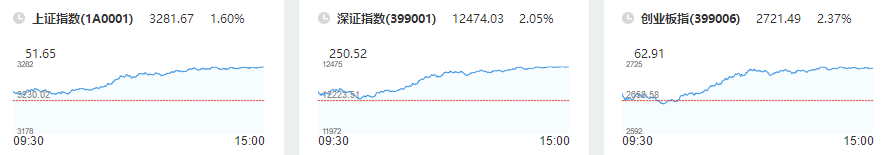 三大指数今日放量反弹,沪指午后涨超1.5%,深成指、创业板指均涨逾2%,两市超3600股飘红;截止收盘,上证指数涨1.6%,深证成指涨2.05%,创业板指涨2.37%;盘面上,消费电子、苹果概念、智能穿戴等板块全天强势,领益智造(5.79 +10.08%诊股)、立讯精密(38.16 +10.00%诊股)等多股涨停或涨超10%;券商、保险、银行等大金融板全线拉升,光大证券(15.66 +9.97%诊股)等多股涨停;半导体芯片板块表现活跃,Chiplet概念持续强势,大港股份(20.20 +10.02%诊股)盘中走出8连板;元宇宙、厨卫电器、医疗医药等板块表现强势,基建、有机硅等板块盘中拉升;汽车零部件、工业母机等板块表现低迷,贵金属、钙钛矿电池等板块今日回调下挫。两市全天成交10667亿,为时隔5个交易日再突破1万亿元。