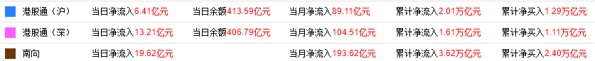 截至8月11日港股收盘,南向资金今日合计净流入19.62亿港元,其中,沪市港股通净流入6.41港元,深市港股通净流入13.21亿港元。
