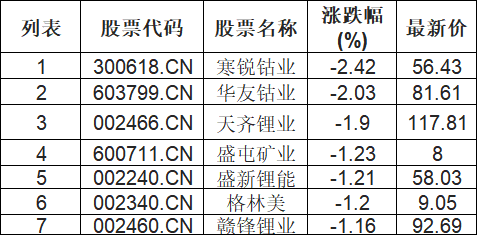 能源金属板块下挫,寒锐钴业(300618.CN)跌2.42%