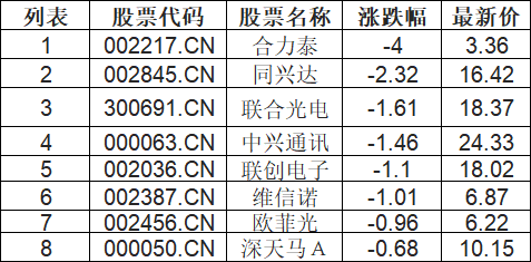 屏下摄像板块下挫,合力泰(002217.CN)跌4.0%