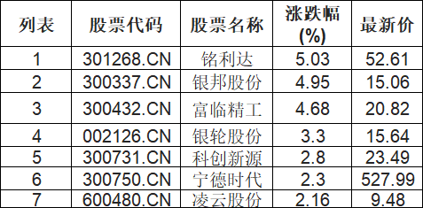 麒麟电池板块拉升,铭利达(301268.CN)涨5.03%