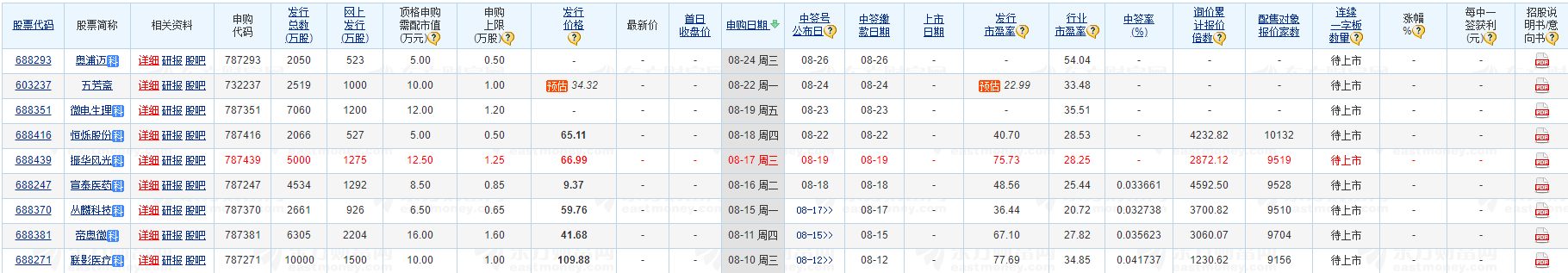 8月17日,振华风光(688439.SH)开启申购,发行价格66.99元/股,申购上限为1.25万股,市盈率75.73倍,属于上交所科创板,中信证券为其独家保荐人。