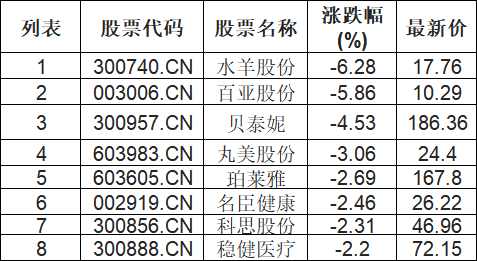 截至13:00,美容护理板块下挫。水羊股份(300740.CN)跌6.28%报17.76元,百亚股份(003006.CN)跌5.86%报10.29元,贝泰妮(300957.CN)跌4.53%报186.36元,丸美股份(603983.CN)跌3.06%报24.4元,珀莱雅(603605.CN)跌2.69%报167.8元,名臣健康(002919.CN)跌2.46%报26.22元,科思股份(300856.CN)跌2.31%报46.96元,稳健医疗(300888.CN)跌2.20%报72.15元。