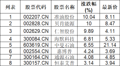 截至13:15,采掘行业板块拉升。准油股份(002207.CN)涨10.04%报8.11元,贝肯能源(002828.CN)涨10.00%报8.47元,仁智股份(002629.CN)涨9.89%报4.11元,海默科技(300084.CN)涨6.81%报5.33元,中曼石油(603619.CN)涨6.55%报21.14元,惠博普(002554.CN)涨4.24%报3.69元,通源石油(300164.CN)涨4.08%报4.85元,恒泰艾普(300157.CN)涨3.14%报3.94元。