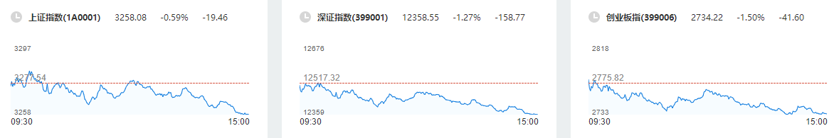 截至今日收盘,沪指报3258.08点,跌幅0.59%,成交额4578.63亿元;深成指报12358.55点,跌幅1.27%,成交额6623.49亿元;创业板指报2734.22点,跌幅1.50%,成交额2329.23亿元。