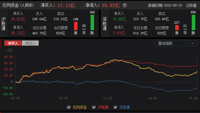 数据显示,北向资金全天净流入17.13亿元。其中,沪股通资金净流入26.81亿元,深股通资金净流出9.68亿元。