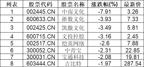 游戏板块下挫,中南文化(002445.CN)跌7.91%