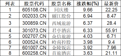 旅游酒店板块拉升,同庆楼(605108.CN)涨9.66%
