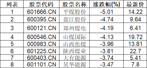煤炭行业板块低开,平煤股份(601666.CN)跌5.01%