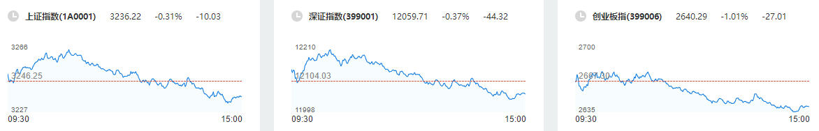 截止收盘,上证指数报收3236.22点,下跌10.03点,跌幅0.31%。成交额3976亿。深证成指报收12059.71点,下跌44.32点,跌幅0.37%,成交额5316亿。创业板指报收2640.29点,下跌27.01点,跌幅1.01%,成交额1720亿。沪深两市,个股共计上涨1888只,下跌2978只,涨停45只,跌停35只。