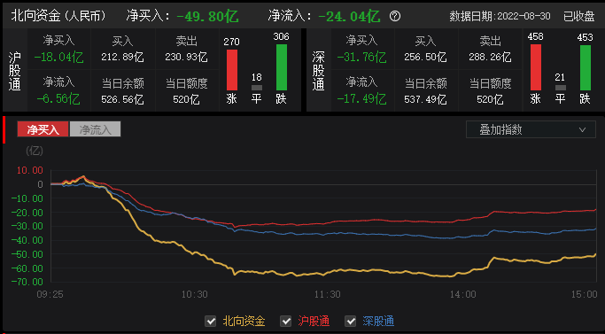 北向资金全天流出49.80亿元,沪股通净卖出18.04亿元;深股通净卖出36.76亿元。