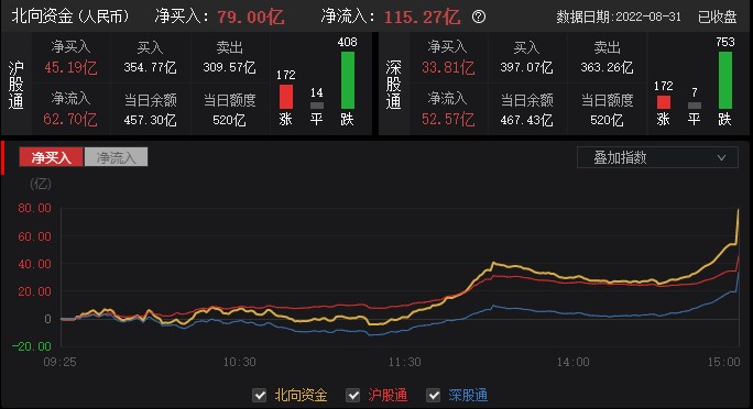 北向资金午后加速进场,尾盘再度抢筹,全天净买入79亿元,本月累计加仓127亿元。MSCI 8月指数季度调整今日盘后生效。