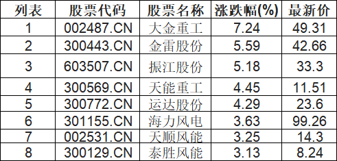 风电设备板块拉升,大金重工(002487.CN)涨7.24%