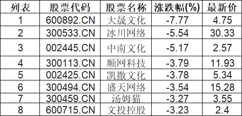 游戏板块下挫,大晟文化(600892.CN)跌7.77%