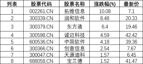 截至09:45,华为欧拉板块拉升。拓维信息(002261.CN)涨10.08%报7.1元,润和软件(300339.CN)涨8.48%报20.33元,东方通(300379.CN)涨6.40%报19.46元,诚迈科技(300598.CN)涨4.59%报42.42元,中国软件(600536.CN)涨4.18%报39.36元,创意信息(300366.CN)涨2.54%报7.67元,天源迪科(300047.CN)涨1.57%报6.45元,宝兰德(688058.CN)涨1.52%报41.47元。