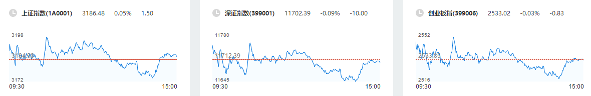 截止收盘,上证指数报收3186.48点,上涨1.5点,涨幅0.05%。成交额3133亿。深证成指报收11702.39点,下跌10.00点,跌幅0.09%,成交额4333亿。创业板指报收2533.02点,下跌0.83点,跌幅0.03%,成交额1434亿。沪深两市,个股共计上涨3739只,下跌1137只,涨停69只,跌停10只。