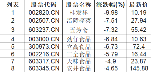 食品饮料板块下挫,桂发祥(002820.CN)跌9.98%