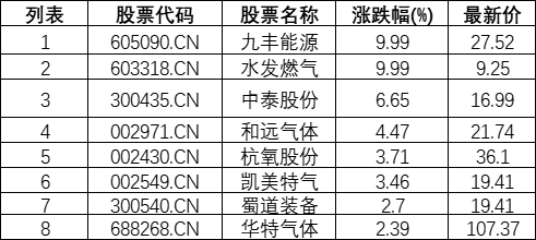 氦气概念板块拉升,九丰能源(605090.CN)涨9.99%