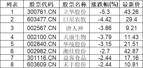 鸡肉概念板块下挫,立华股份(300761.CN)跌5.3%