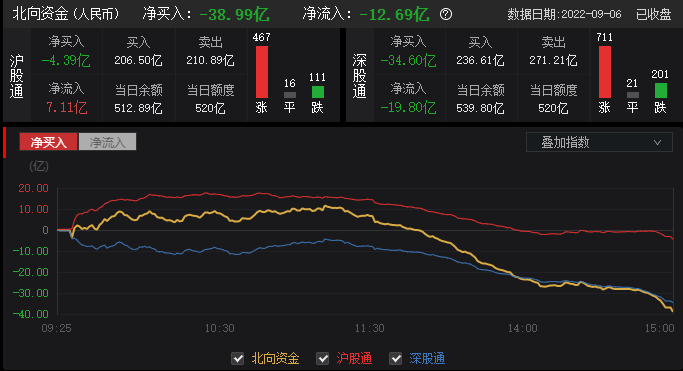 北向资金早盘小幅净流入,午后快速流出,全天净卖出38.99亿元;其中,沪股通净卖出4.39亿元,深股通净卖出34.6亿元;近4个交易日北向资金已累计净卖出超160亿元。