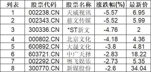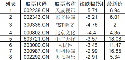 文化传媒板块下挫,天威视讯(002238.CN)跌5.71%