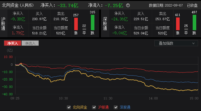9月7日下午,以买卖成交额口径(挂单已成交)统计,截至目前北向资金净卖出超30亿元,其中沪股通净卖出9.28亿元,深股通净卖出21.31亿元。以余额规模口径(已挂单)统计,北向资金净流出超20亿元,其中沪股通净流出5.24亿元,深股通净流出15.68亿元。