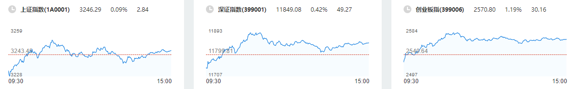 截至收盘,沪指微涨0.09%报3246.29点,深成指涨0.42%报11849.08点,创业板指涨1.19%报2570.8点,科创50指数涨1.33%;两市合计成交8719亿元,北向资金净卖出33.74亿元。