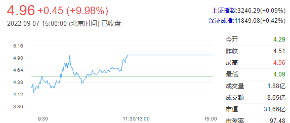 重要资讯:沪深交易所2022年09月07日公布的交易公开信息显示,粤宏远A因成为当日价格振幅达到15%的证券上榜。粤宏远A当日收报4.96元,涨跌幅9.98%,振幅21.27%,换手率29.76%,成交额8.65亿元。