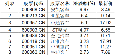 汽车整车板块拉升,安凯客车(000868.CN)涨9.97%