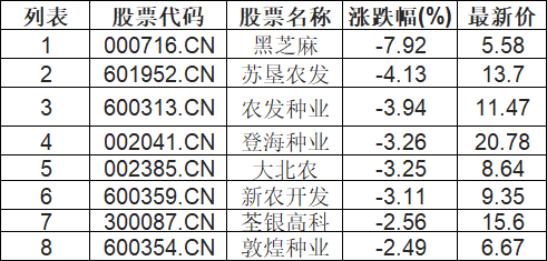 粮食概念板块下挫,黑芝麻(000716.CN)跌7.92%