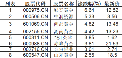 贵金属板块拉升,银泰黄金(000975.CN)涨6.64%