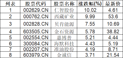 采掘行业板块拉升,仁智股份(002629.CN)涨10.02%