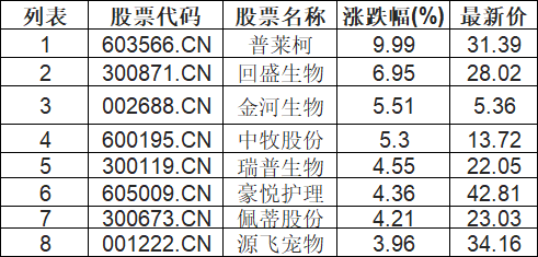 宠物经济板块拉升,普莱柯(603566.CN)涨9.99%