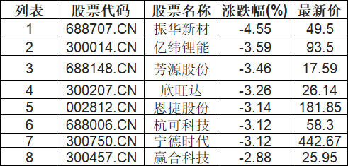 电池板块下挫,振华新材(688707.CN)跌4.55%