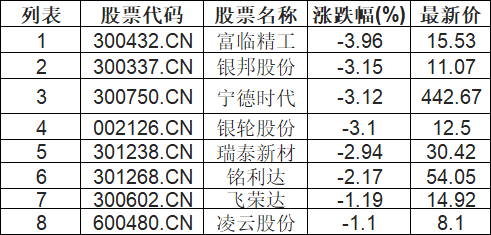 麒麟电池板块下挫,富临精工(300432.CN)跌3.96%