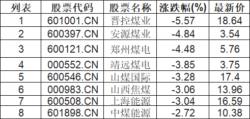煤炭行业板块低开,晋控煤业(601001.CN)跌5.57%