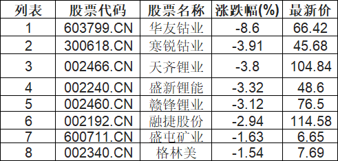 能源金属板块下挫,华友钴业(603799.CN)跌8.6%