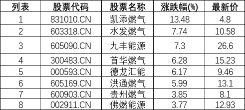 燃气板块高开,凯添燃气(831010.CN)涨13.48%