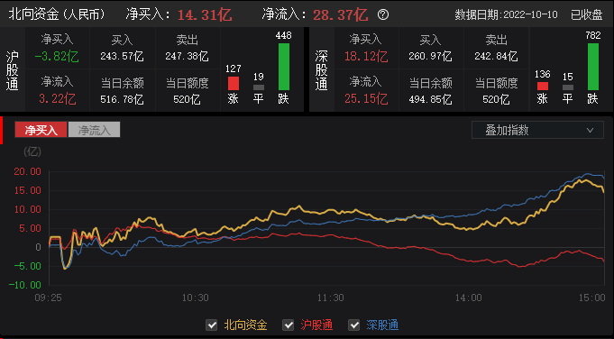 北向资金全天净买入14.31亿元,其中沪股通净卖出3.82亿元,深股通净买入18.12亿元。