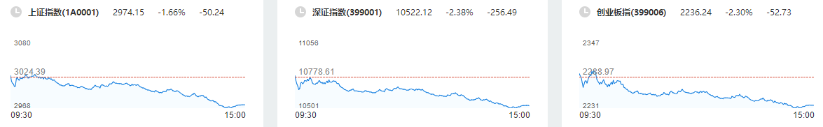 10月10日,大盘指数全天呈下行趋势,沪指失守3000点,深成指、创指跌超2%。截至收盘,沪指报2974.33点,跌1.66%;深成指报10525.13点,跌2.35%;创指报2236.38点,跌2.30%。今日成交额为6215亿元。