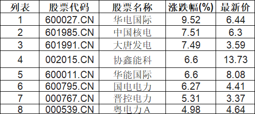 电力行业板块拉升,华电国际(600027.CN)涨9.52%