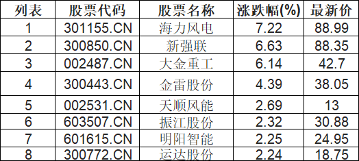 风电设备板块拉升,海力风电(301155.CN)涨7.22%