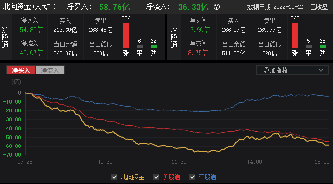 10月12日,北向资金全天净卖出58.76亿元,其中沪股通净卖出54.85亿元,深股通净卖出3.9亿元。