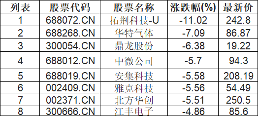 中芯概念板块下挫,拓荆科技-U(688072.CN)跌11.02%