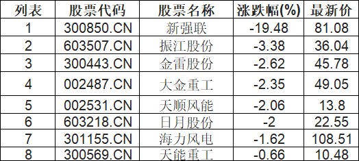 风电设备板块低开,新强联(300850.CN)跌19.48%