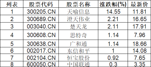 eSIM板块高开,天喻信息(300205.CN)涨14.55%